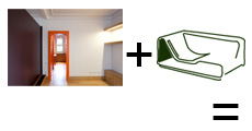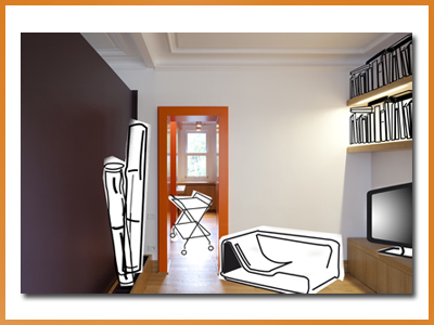 Progetto di graphic design con inserimento disegnato di una serie di mobili ed oggetti in una casa vuota fotografata a Parigi.